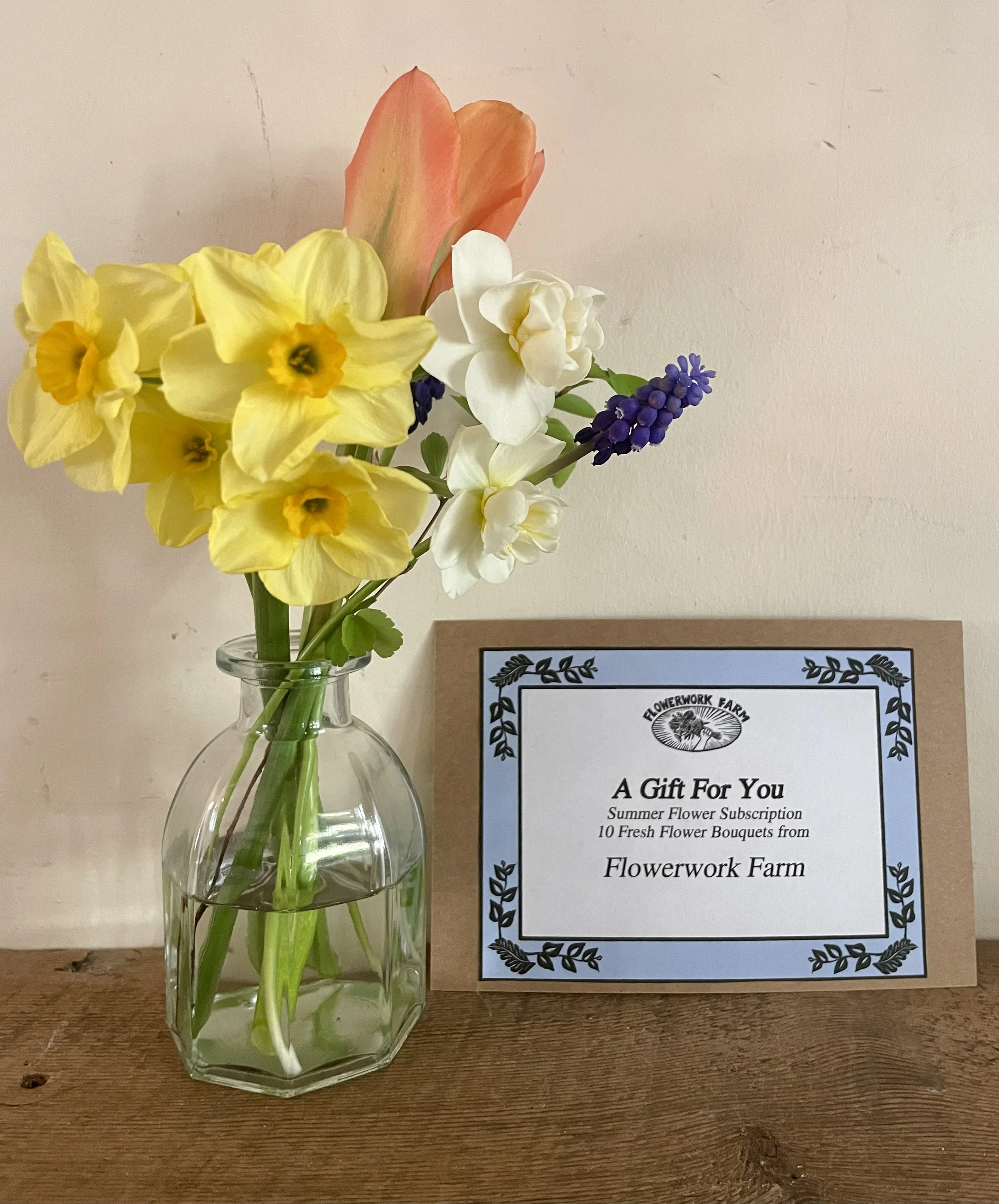 Give mom a summer filled with flowers. Gift 10 weeks of our freshest bouqeuts for $180. This gift comes with a sampling in a bud vase and a gift certificate to present to the mother in your life on her special day.